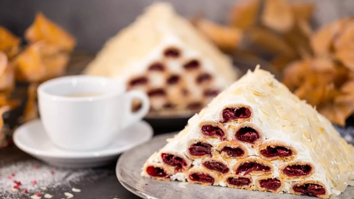 Den deilige klosterhyttekaken er en av de mest «vinterlige» dessertene. Det er ikke bare velsmakende, men også en vakker dessert, som minner om snødekt ved. Ideen med retten er ganske enkel – deigrør er fylt med kirsebær, stablet oppå hverandre i form av en pyramide og smurt med rømme. Den ferdige desserten er søt og syrlig, med en bærnote, og veldig lett for magen.